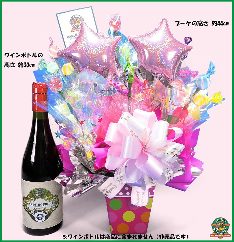ギフト対応 キュートな置き型ブーケ! 内容 ラムネ6個 キャンディ18個 サイズ 高さ440×横330×奥行き230mm 賞味期限 1ヶ月以上〜 原産国 日本・トルコ 保存方法 高温多湿をお避け下さい キャンディブーケに利用するキャンディ・チョコレートは、季節や在庫状況により変わる場合もございます。